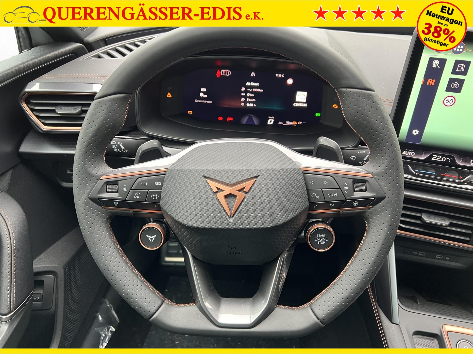 ACC bis 210km/h, Fernlichtassistent, 3-Zonen-Climatronic, Digital Cockpit Plus, Induktive Ladefunktion, Wireless Full Link,  Supersport-Multifunktionslederlenkrad beheizbar, LED-Tagfahrlicht, 230V Steckdose im Kofferraum, 2* USB-C vorne 2* USB-C hinten, Fahrer- und Beifahrerairbag, Außenspiegel elektrisch verstell- , beheiz- und anklappbar, Coming Home-/ Leaving Home Funktion, Dachhimmel schwarz, XDS, Front Assist, Innenspiegel autom. abblendbar, ISOFIX, Mittelarmlehne vorne, abgedunkelte Seitenscheiben ab der B-Säule, Sprachsteuerung, Cupra Drive Profil, Parksensoren vorne und hinten, Licht und Regensensor, DAB, el. Handbremse inkl. auto Hold, el. Fensterheber vorne und hinten, Gepäckraumabdeckung, LED- Nebelscheinwerfer, LED-Rückleuchten mit dynamischen Blinker, variabler Ladeboden, Mittelarmlehne hinten, Rücksitzlehne geteilt umklappbar, Reifendruckkontrolle, Start-Stopp- Funktion, Tank 45l, Verkehrszeichenerkennung, el. Wegfahrsperre, eCall, Dachreling schwarz uvm.