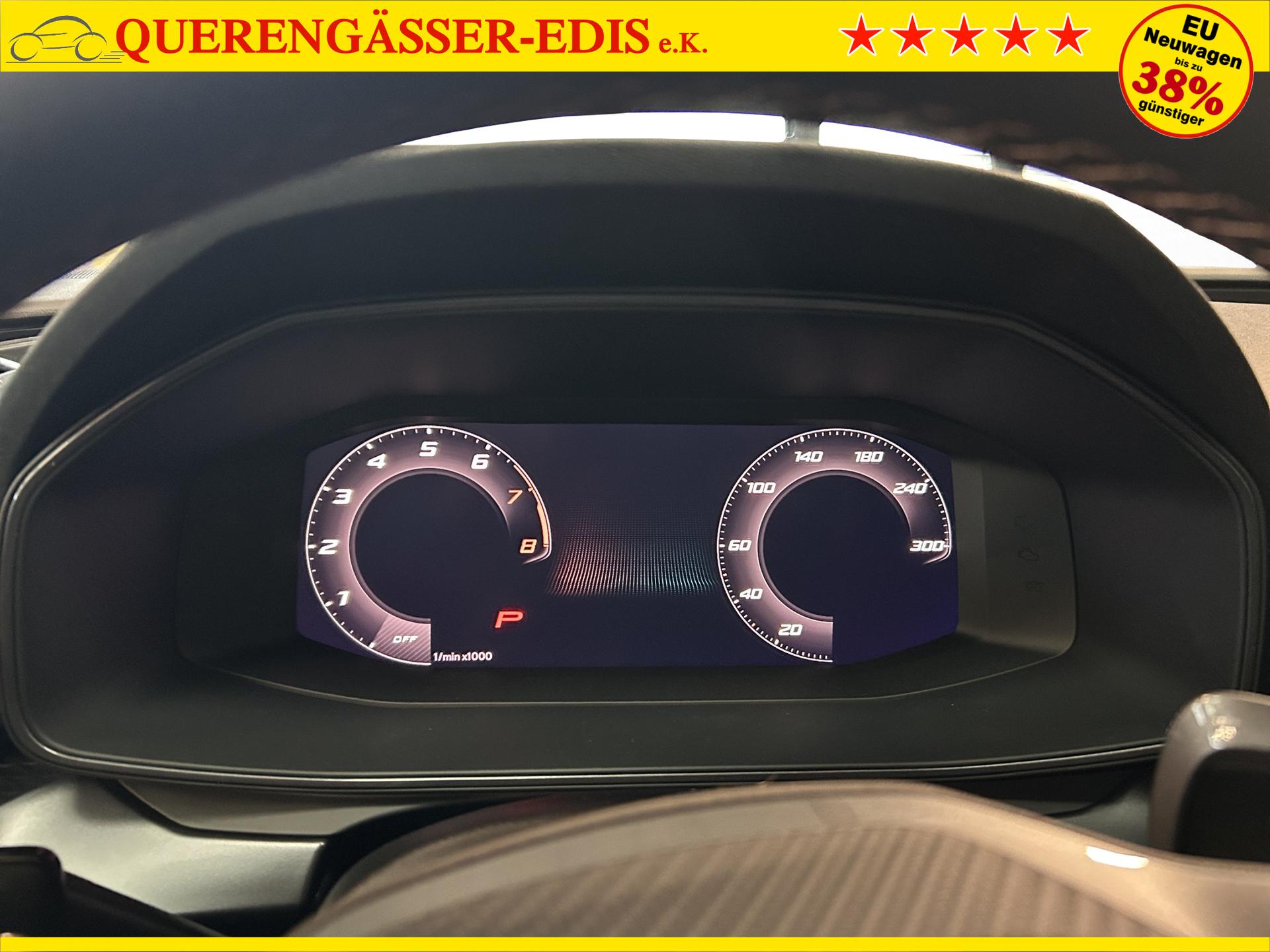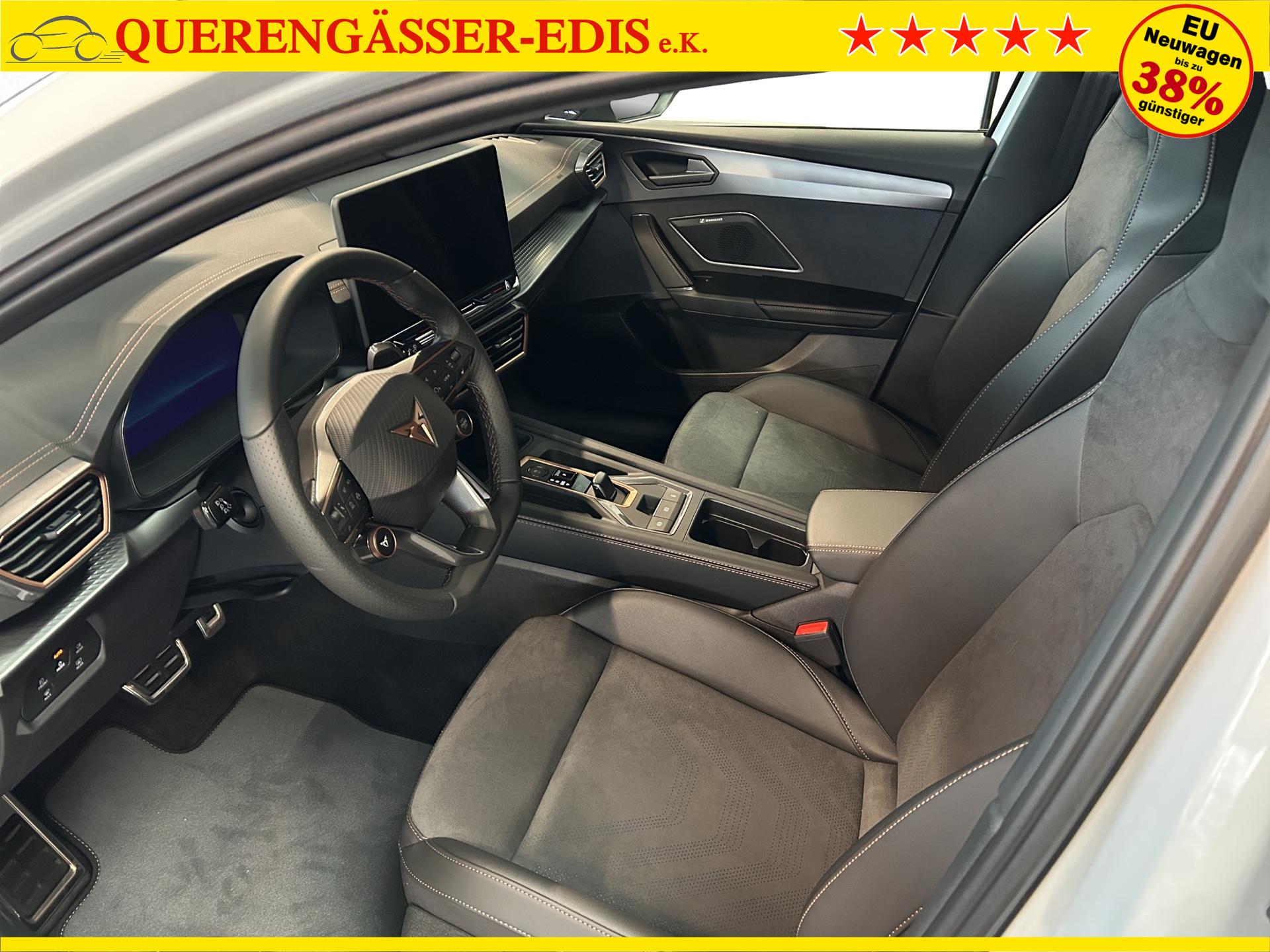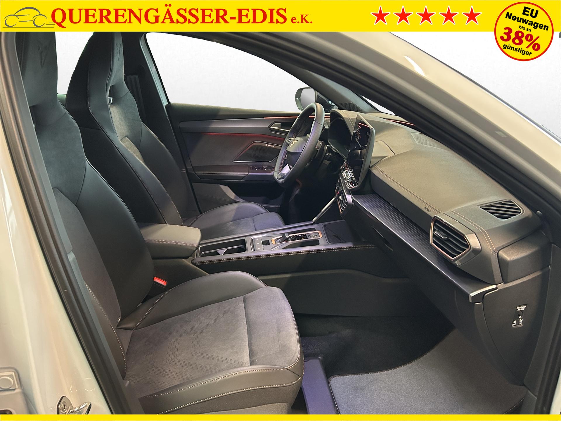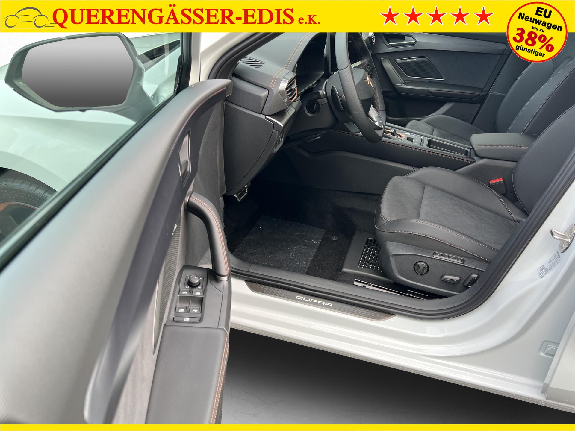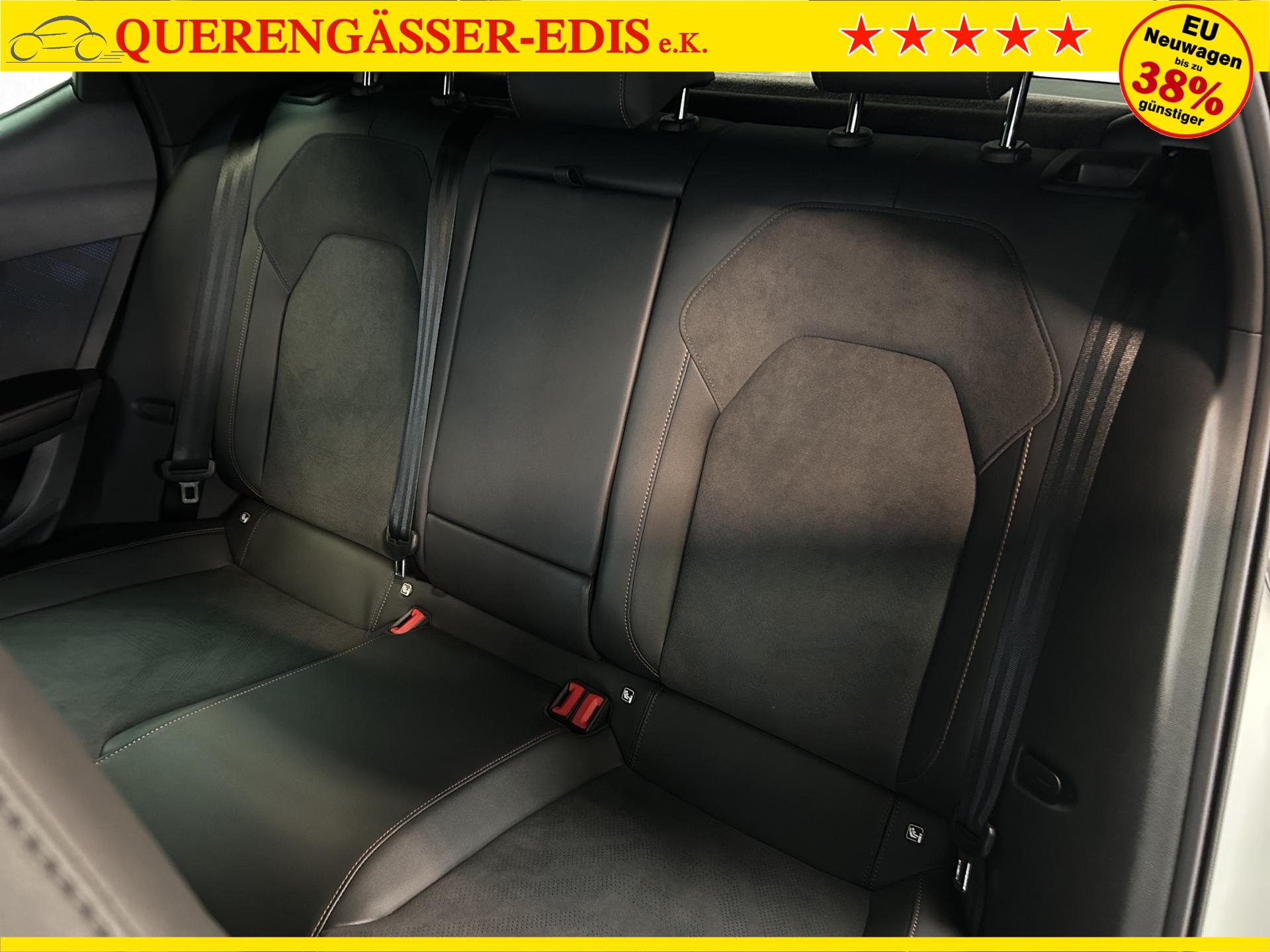 SERIENAUSSTATTUNG: ACC bis 210km/h, Fernlichtassistent, 3-Zonen-Climatronic, Digital Cockpit Plus, Induktive Ladefunktion, Wireless Full Link, Supersport-Multifunktionslederlenkrad beheizbar, LED-Tagfahrlicht, 230V Steckdose im Kofferraum, 2* USB-C vorne 2* USB-C hinten, Fahrer- und Beifahrerairbag, Außenspiegel elektrisch verstell- , beheiz- und anklappbar, Coming Home-/ Leaving Home Funktion, Dachhimmel schwarz, XDS, Front Assist, Innenspiegel autom. abblendbar, ISOFIX, Mittelarmlehne vorne, abgedunkelte Seitenscheiben ab der B-Säule, Sprachsteuerung, Cupra Drive Profil, Parksensoren vorne und hinten, Licht und Regensensor, DAB, el. Handbremse inkl. auto Hold, el. Fensterheber vorne und hinten, Gepäckraumabdeckung, LED- Nebelscheinwerfer, LED-Rückleuchten mit dynamischen Blinker, Mittelarmlehne hinten, Rücksitzlehne geteilt umklappbar, Reifendruckkontrolle, Start-Stopp- Funktion, Tank 45l, Verkehrszeichenerkennung, el. Wegfahrsperre, eCall, uvm.
