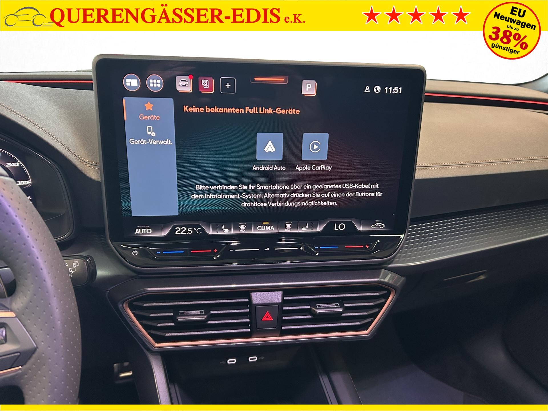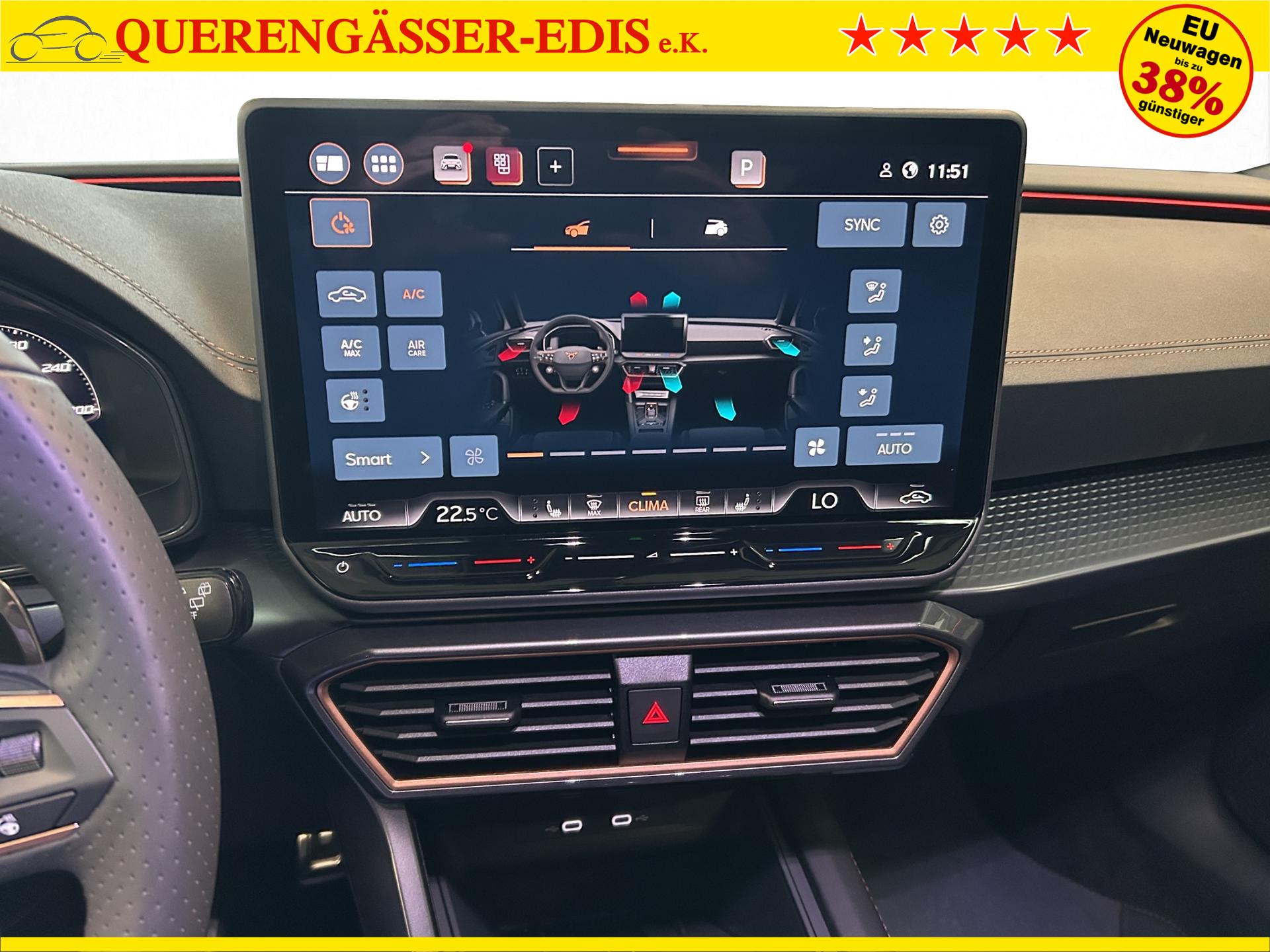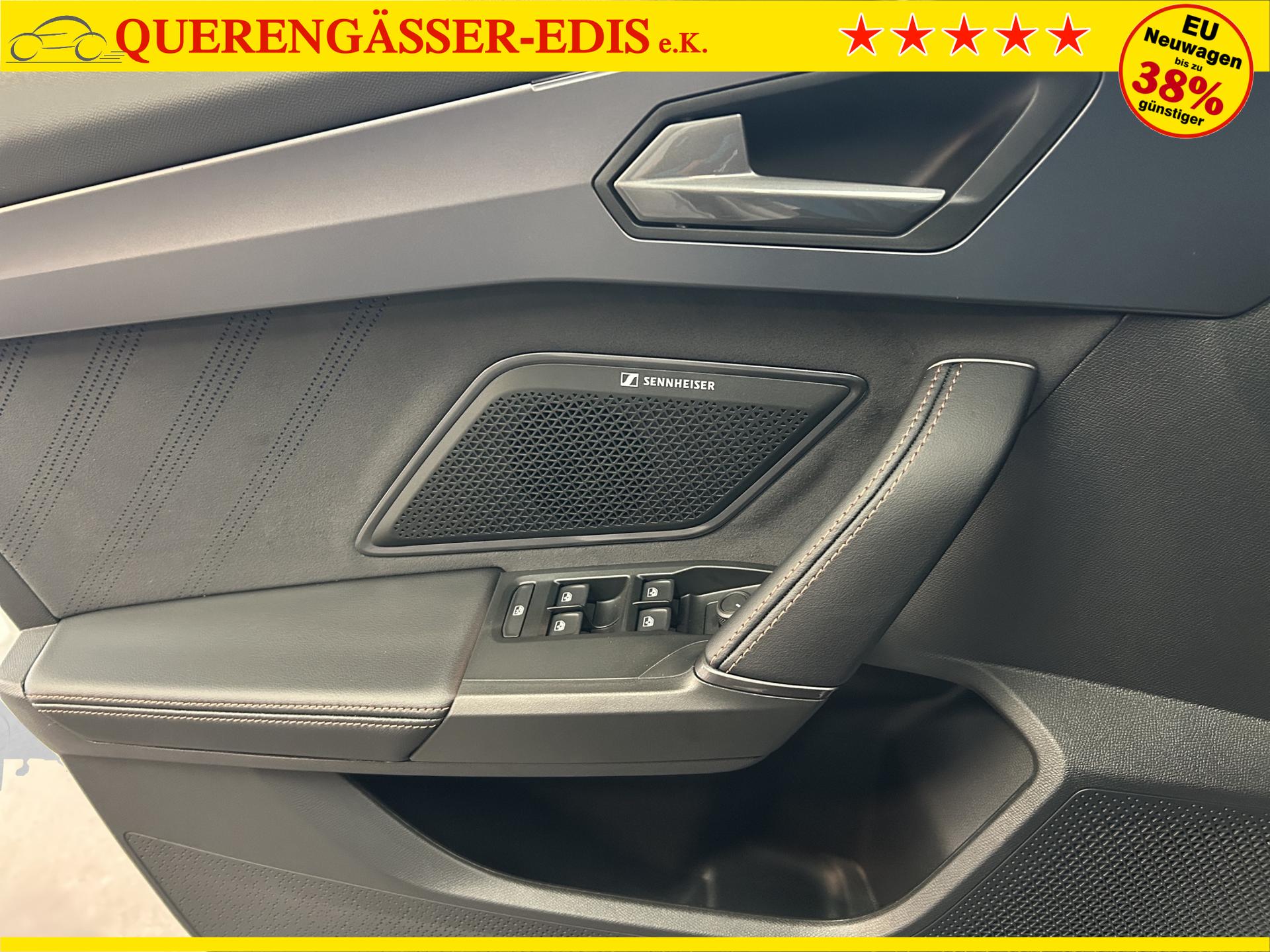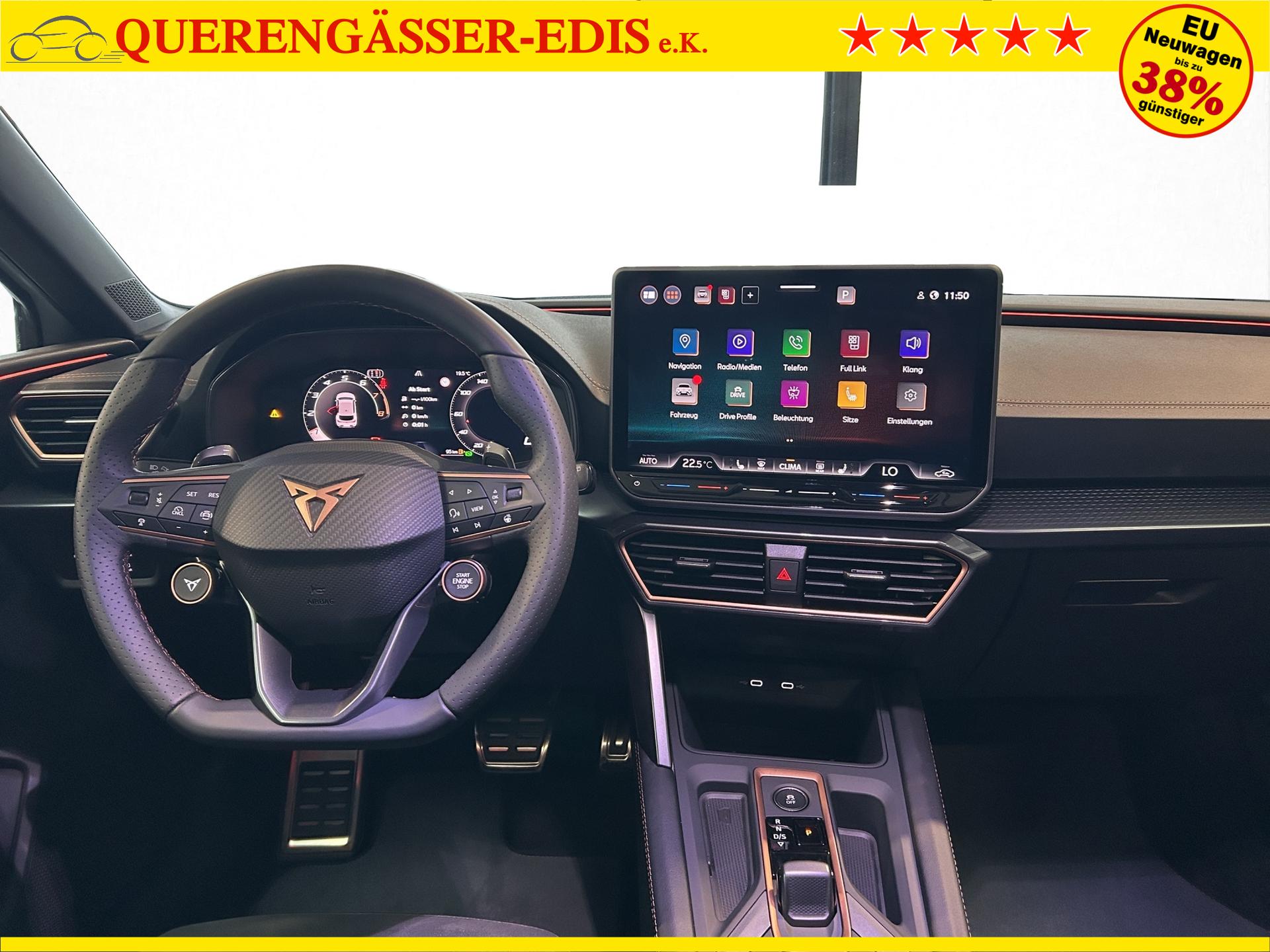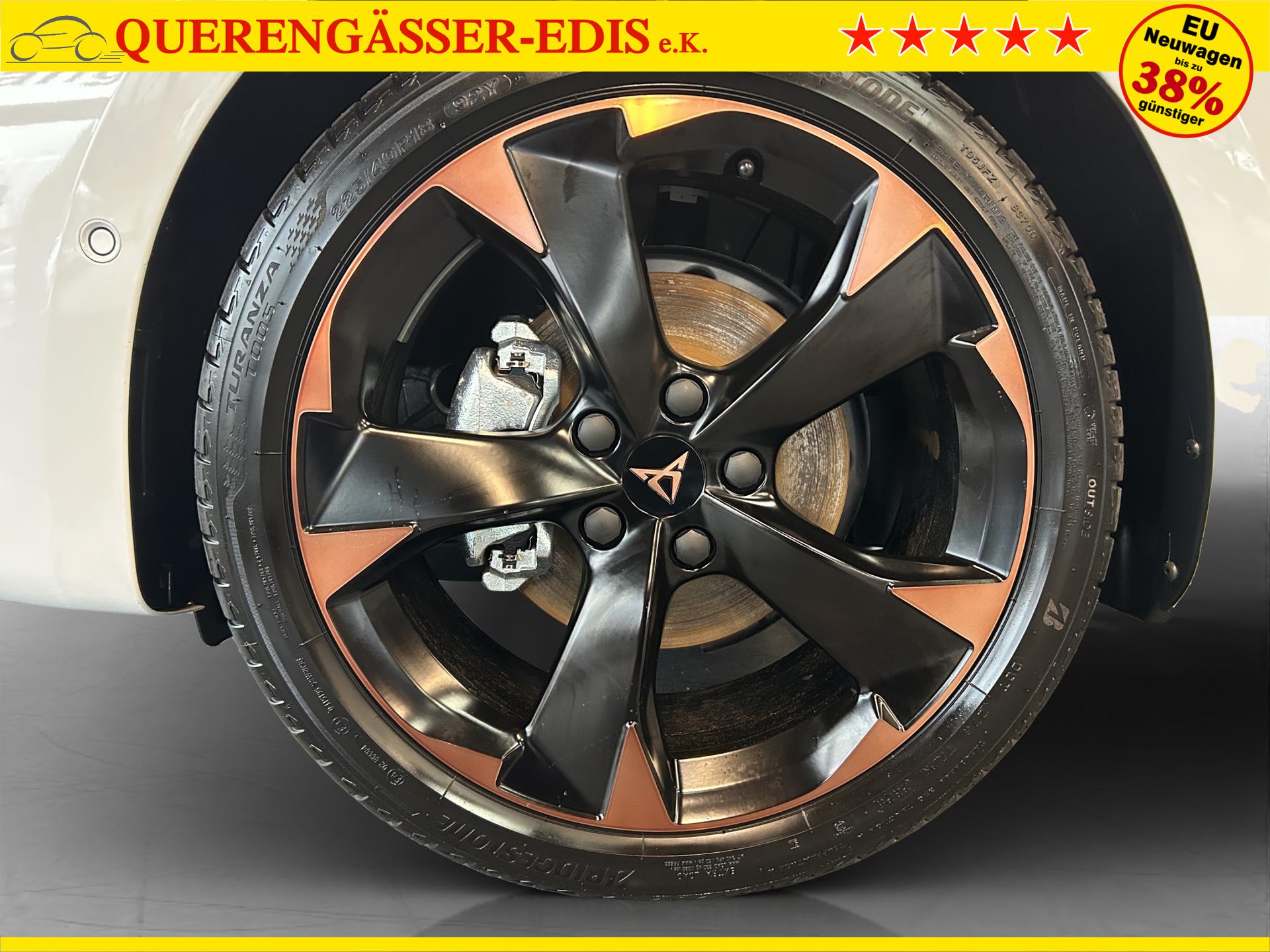 SERIENAUSSTATTUNG: ACC bis 210km/h, Fernlichtassistent, 3-Zonen-Climatronic, Digital Cockpit Plus, Induktive Ladefunktion, Wireless Full Link, Supersport-Multifunktionslederlenkrad beheizbar, LED-Tagfahrlicht, 230V Steckdose im Kofferraum, 2* USB-C vorne 2* USB-C hinten, Fahrer- und Beifahrerairbag, Außenspiegel elektrisch verstell- , beheiz- und anklappbar, Coming Home-/ Leaving Home Funktion, Dachhimmel schwarz, XDS, Front Assist, Innenspiegel autom. abblendbar, ISOFIX, Mittelarmlehne vorne, abgedunkelte Seitenscheiben ab der B-Säule, Sprachsteuerung, Cupra Drive Profil, Parksensoren vorne und hinten, Licht und Regensensor, DAB, el. Handbremse inkl. auto Hold, el. Fensterheber vorne und hinten, Gepäckraumabdeckung, LED- Nebelscheinwerfer, LED-Rückleuchten mit dynamischen Blinker, Mittelarmlehne hinten, Rücksitzlehne geteilt umklappbar, Reifendruckkontrolle, Start-Stopp- Funktion, Tank 45l, Verkehrszeichenerkennung, el. Wegfahrsperre, eCall, uvm.