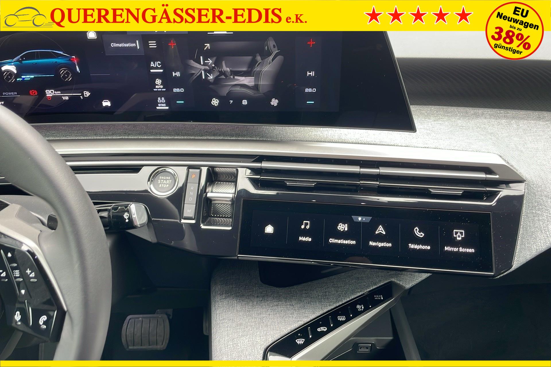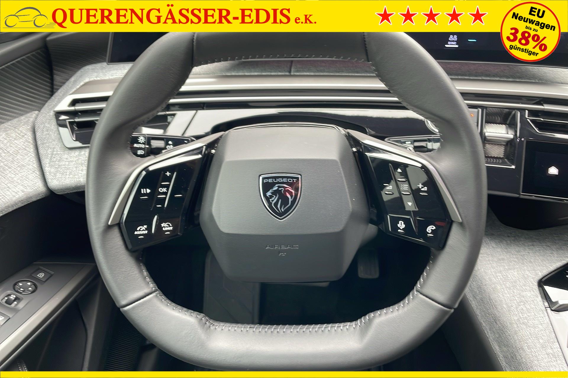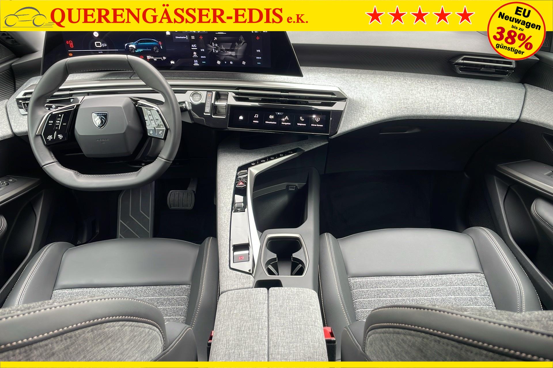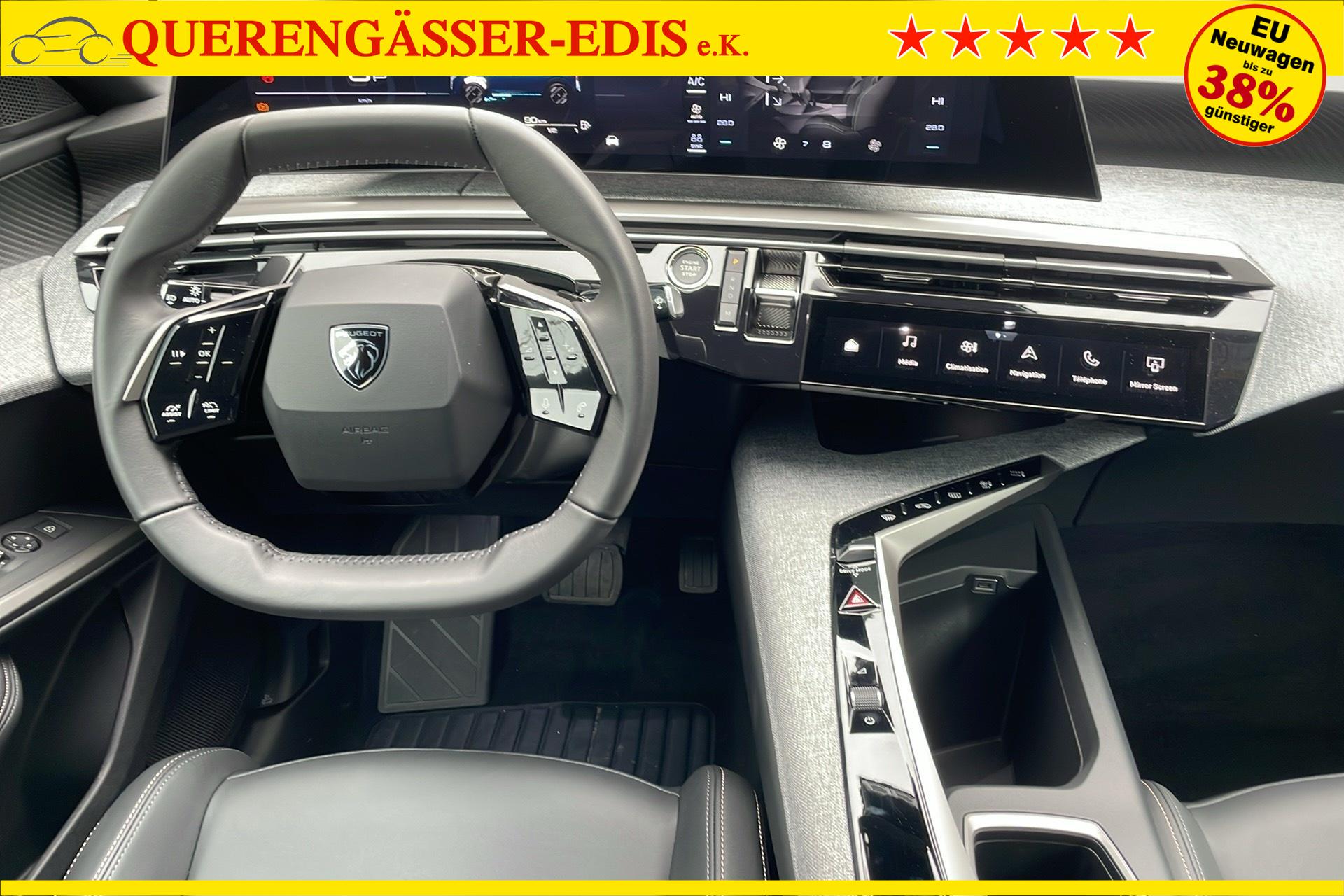 • Panoramic Navigation Pack PEUGEOT i-Cockpit mit gebogenem, schwebendem 21-HD-Bildschirm, virtuelle PEUGEOT i-Toggles mit 10 anpassbaren Schnellzugriffstasten, PEUGEOT i-Connect Advanced: Vernetzte 3D-Navigation: 3 USB-Anschlusse: 1 USB-C-Anschluss (Daten & Laden) vorne, 2 USB-C-Anschlusse (Laden) hinten, 2 12-V-Anschlusse (Mittelkonsole, Kofferraum) Connect Plus (6-monatiges Abonnement inklusive) Kabelloses Laden des Smartphones (15 W): Kabelloses Laden des Smartphones (Leistung 15 W) PEUGEOT i-Cockpit mit gebogenem, schwebendem 21-HD-Bildschirm Virtuelle PEUGEOT i-Toggles mit 10 personalisierbaren Schnellzugriffen PEUGEOT i-Connect Advanced Vernetzte 3D-Navigation, 4 USB-Anschlusse: 1 USB-C-Anschluss (Daten & Laden) und 1 USB-C-Anschluss (Laden) vorne, 2 USB-C-Anschlusse (Laden) hinten PEUGEOT i-Connect Advanced - Connect Plus: Vernetzte Spracherkennung in naturlicher Sprache, Chat - GPT (spater verfugbar) Sicherheitsdienste: Vernetzte Alarmanlage (wenn das Fahrzeug mit einer Alarmanlage ausgestattet ist) Fernbedienungsdienste (E Remote Control, Remote Control, Find My Car, My Trip Report, Peugeot Skill for Alexa), Navigationsfunktionen (Verkehrsinformationen in Echtzeit, Wettervorhersagen, Parkplatze, TomTom-Suche, Geschwindigkeitsbegrenzungen, Kraftstoffpreise, Over-the-Air-Kartenaktualisierung, Send to Nav, Geofenci