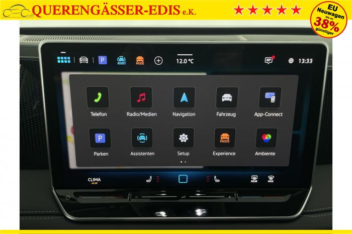 2 USB-C-Ladebuchsen an der Mittelkonsole hinten, 2 USB-C-Schnittstellen vorn, 8 Lautsprecher, App-Connect Wireless für Apple CarPlay und Android Auto, Digitaler Radioempfang DAB , Infotainment-Paket inkl. Navigationssystem Discover, Sprachbedienung, Telefonschnittstelle Comfort mit induktiver Ladefunktion, Touchscreen (32,2 cm/12,9 Zoll), 3D-LED-Rückleuchten, Abbiege- und Schlechtwetterlicht, Ambientebeleuchtung 10-farbig, Fahrlichtschaltung automatisch, mit LED-Tagfahrlicht sowie Begrüßungs- und Verabschiedungslicht, LED-Plus-Scheinwerfer, Leiste zwischen den Scheinwerfern und Rückleuchten sowie Türgriffmulden beleuchtet, Leuchtweitenregulierung dynamisch, Panorama-Ausstell-/Schiebedach mit Panoramadach hinten, Verbundsicherheitsglas geräuschdämmend für Türscheiben, Heck- und Seitenscheiben hinten abgedunkelt, Bedarfsorientierte Batterieladung, Innenspiegel automatisch abblendend, Mittelarmlehne vorn, Multifunktionslenkrad in Leder, beheizbar, mit Schaltwippen, Netztrennwand, Textilfußmatten vorn und hinten, Klimaanlage Air Care Climatronic mit Aktiv-Kombifilter, Bedienelementen hinten und 3-Zonen-Temperaturregelung, Design-Paket, Komfortpaket inkl. Memory-Funktion für Parkassistent, Paket Endless, Paket No Limit, Winterpaket inkl. Lenkrad beheizbar, 18 Leichtmetallräder Bologna in Schwarz, Oberfläche glanzgedreht, Tire Mobility Set: 12-Volt-Kompressor und Reifendichtmittel, Airbag für Fahrer und Beifahrer, mit Beifahrerairbag-Deaktivierung, Diebstahlwarnanlage mit Innenraumüberwachung, Back-up-Horn und Abschleppschutz, Elektronisches Stabilisierungsprogramm und elektromechanischer Bremskraftverstärker, ISOFIX-Halteösen für Kindersitze auf den äußeren Rücksitzen sowie auf dem Beifahrersitz, Kopf- und Seitenairbags vorn und hinten, Center-Airbag vorn, Notruf-Service, keine Registrierung notwendig, Dienst ist bei Auslieferung aktiviert, Wegfahrsperre elektronisch, Beifahrersitzlehne komplett umklappbar, Komfortsitze vorn, Rücksitzbank längs verschiebbar, -lehne asymmetrisch geteilt umklappbar, Neigung einstellbar, Vordersitze beheizbar, Vordersitze mit Höheneinstellung, Anschlussgarantie 3 Jahre / 100.000 km, 12-V-Steckdose im Gepäckraum, 230-V-Steckdose im Gepäckraum, 12-V-Steckdose in der Mittelkonsole vorn, Automatische Distanzregelung ACC, Berganfahrassistent, Digital Cockpit Pro, mehrfarbig, verschiedene Info-Profile wählbar, Elektronische Parkbremse inkl. Auto-Hold-Funktion, Fernlichtassistent Light Assist, Head-up-Display, Heckklappe mit sensorgesteuerter Öffnung und zeitverzögerter elektrischer Schließung, mit Fernentriegelung, Memory-Funktion für Parkassistent, Müdigkeitserkennung, Notbremsassistent Front Assist mit Fußgänger- und Radfahrererkennung, Parkassistent Park Assist inkl. Einparkhilfe, Regensensor, Reifenkontrollanzeige, Rückfahrkamera Rear View, Schlüsselloses Schließ- und Startsystem Keyless Access, Spurhalteassistent Lane Assist, Spurwechselassistent Side Assist, Umstellung Infotainment / Bordcomputer auf DE, Verkehrszeichenerkennung, Start-Stopp-System mit Bremsenergie-Rückgewinnung, Anhängevorrichtung anklappbar, mit elektrischer Entriegelung, inkl. Anhängerrangierassistent Trailer Assist, Außenspiegel elektrisch einstell-, anklapp- und beheizbar, Außenspiegelgehäuse und Türgriffe in Wagenfarbe, Dachreling silber eloxiert, EU-Fahrzeug mit Tageszulassung